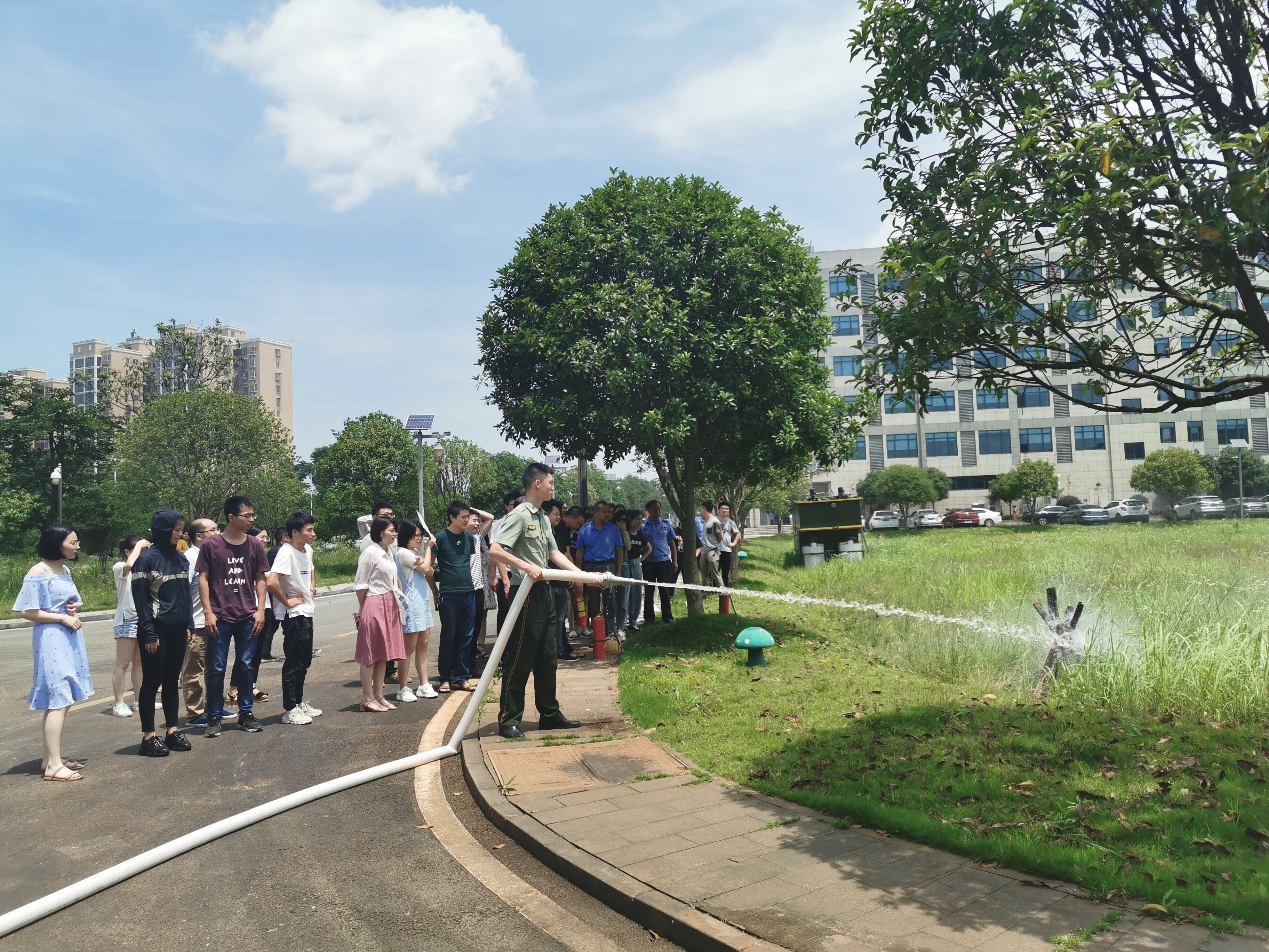 在辦公樓火災(zāi)逃生安全演練環(huán)節(jié),全體員工回到辦公室,當(dāng)聽到消防警報(bào)系統(tǒng)發(fā)出預(yù)警后,大家克服了緊張畏懼情緒,用濕毛巾或手帕捂住口鼻,彎腰按照安全疏導(dǎo)逃生路線有秩序的迅速穿過煙霧區(qū),成功撤離辦公樓。最后,全體員工在藥劑廠前坪學(xué)習(xí)了滅火器和消防水槍的使用。
