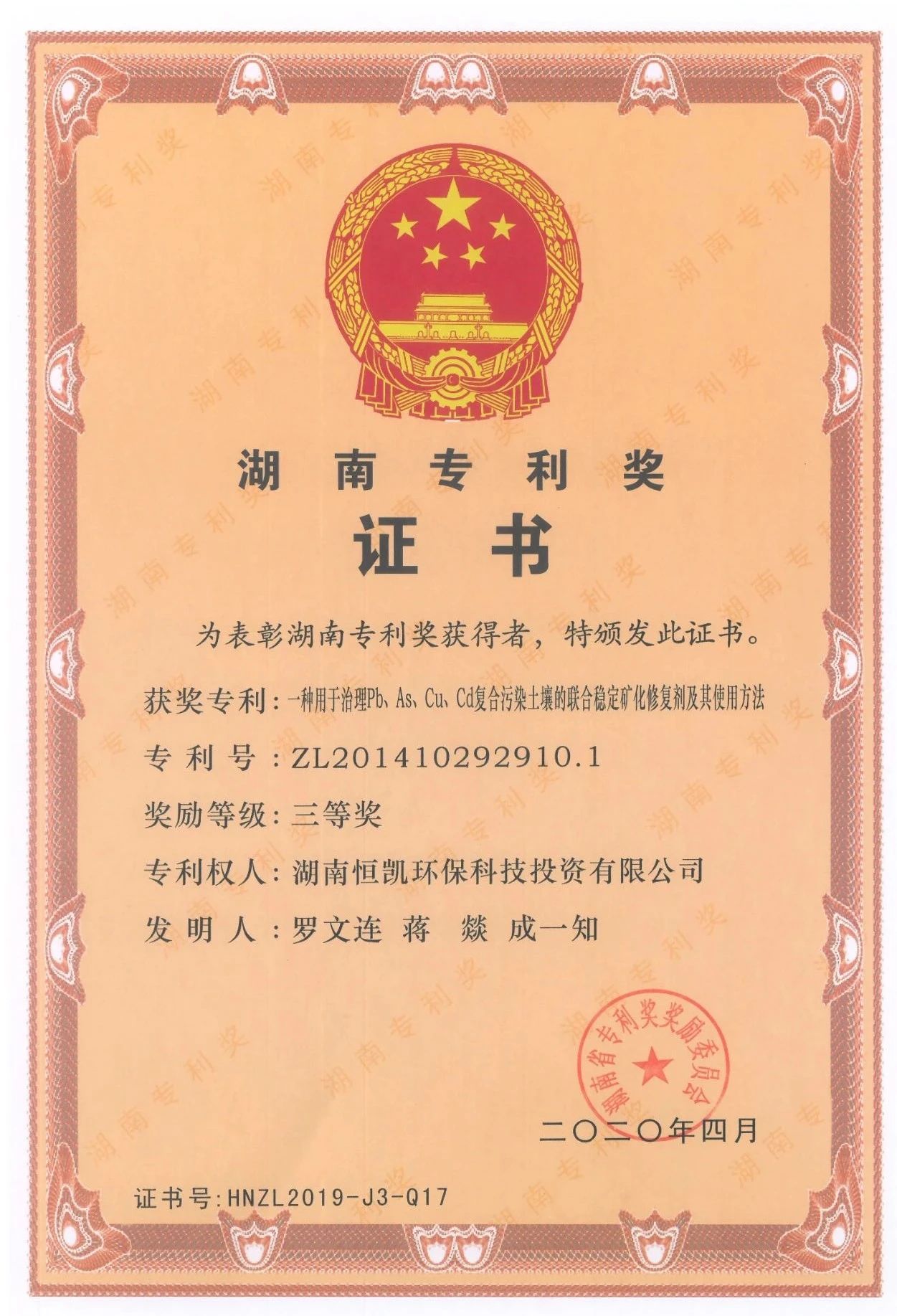 近日,在2020湖南知識產(chǎn)權(quán)宣傳周啟動儀式上,2019年度湖南專利獎揭曉,恒凱環(huán)保自主研發(fā)的發(fā)明專利“一種用于治理Pb、As、Cu、Cd復(fù)合污染土壤的聯(lián)合穩(wěn)定礦化修復(fù)劑及其使用方法”榮獲湖南省專利三等獎。